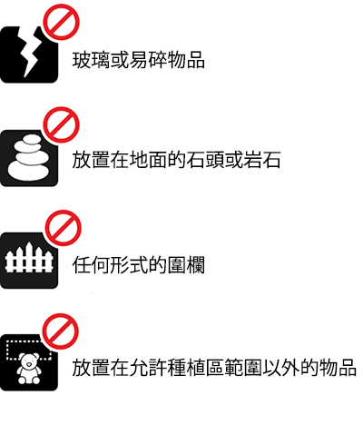 - 任何放置在墓地指定種植區範圍以外的物品或植物。